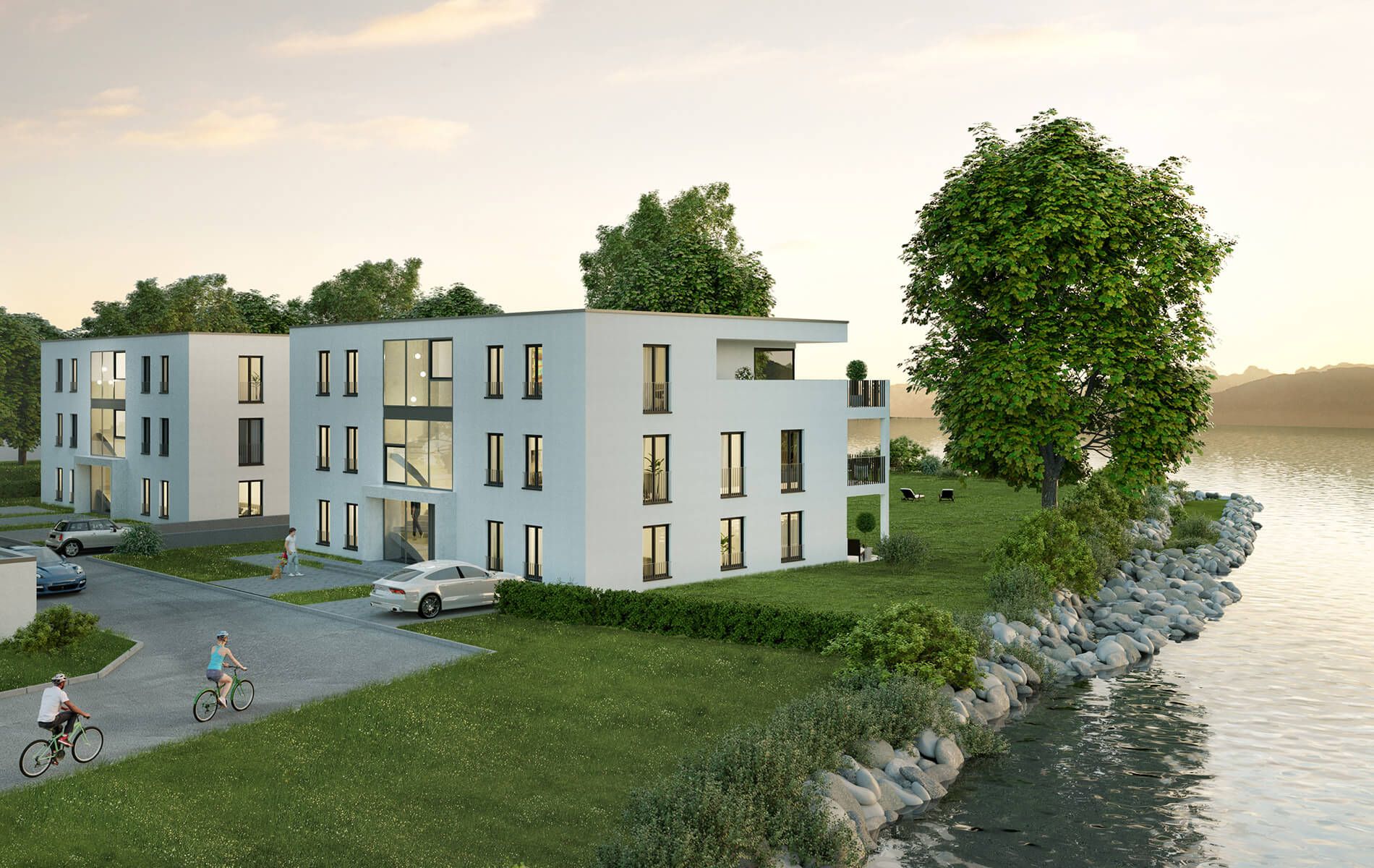 Nur 10 bis 15 Gehminuten vom historischen Zentrum Lindaus entfernt bauen wir zwei Mehrfamilienhäuser mit insgesamt 11 schicken 3-Zimmer-Mietwohnungen. Jede dieser Wohnungen verfügt über einen großen, offenen Wohn-, Ess- und Kochbereich mit bodentiefer Komplettverglasung und einmaligem See- und Bergblick. Die Erdgeschosswohnungen haben große Terrassen und direktem Garten- und Seezugang. Gleichermaßen ziehen sich die tiefen Balkone der Etagenwohnungen über die gesamte Wohnungsbreite.